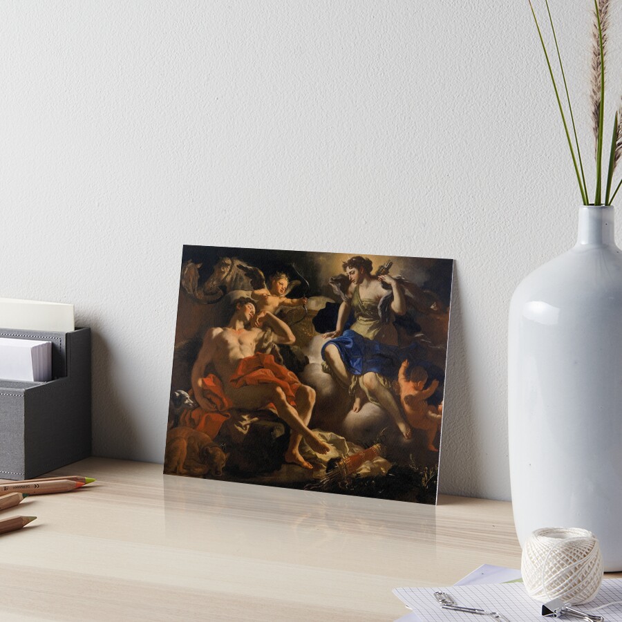 Diana and Endymion is part of the last period of Solimena's works when he mainly concentrated on mythological subjects; he developed this interest in mythological stories which was inspired by the Arcadian movement embracing classical culture. The painting was part of the artist's rivalry with the painter Paolo de Matteis, triggered by the artist's visit to Rome in 1701. Diana in Greek mythology is the goddess associated with hunting, the Moon and chastity, often depicted while hunting, or bathing after the hunt, accompanied by nymphs. Solimena chose to paint Diana's unrequited love towards the young and handsome shepherd; the painting is an allegory of Platonic love. Endymion used to go to sleep on the mountaintop where he guarded his sheep. Diana was falling in love with his beauty, but her love remained unfulfilled, because Diana was a chaste goddess. She is depicted here as a huntress wearing a short robe, arriving from the sky, seated on clouds, in a chariot drawn by horses, while Endymion's body is depicted naked. Cupid points an arrow towards her, ready to shoot. Diana has her gaze fixed on the sleeping youth's body, with a mixture of desire and despair.